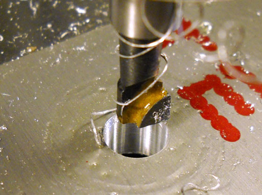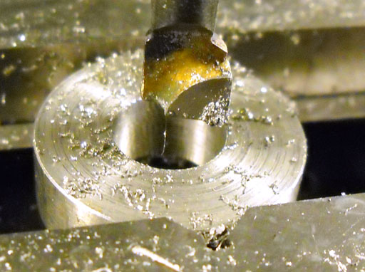 Boring out a steel bushing. I did this at 1000 rpm just to see whether those with the 1/4hp mill motor could use the boring head. Again I got a small amount of chatter but overall the hole is round. |