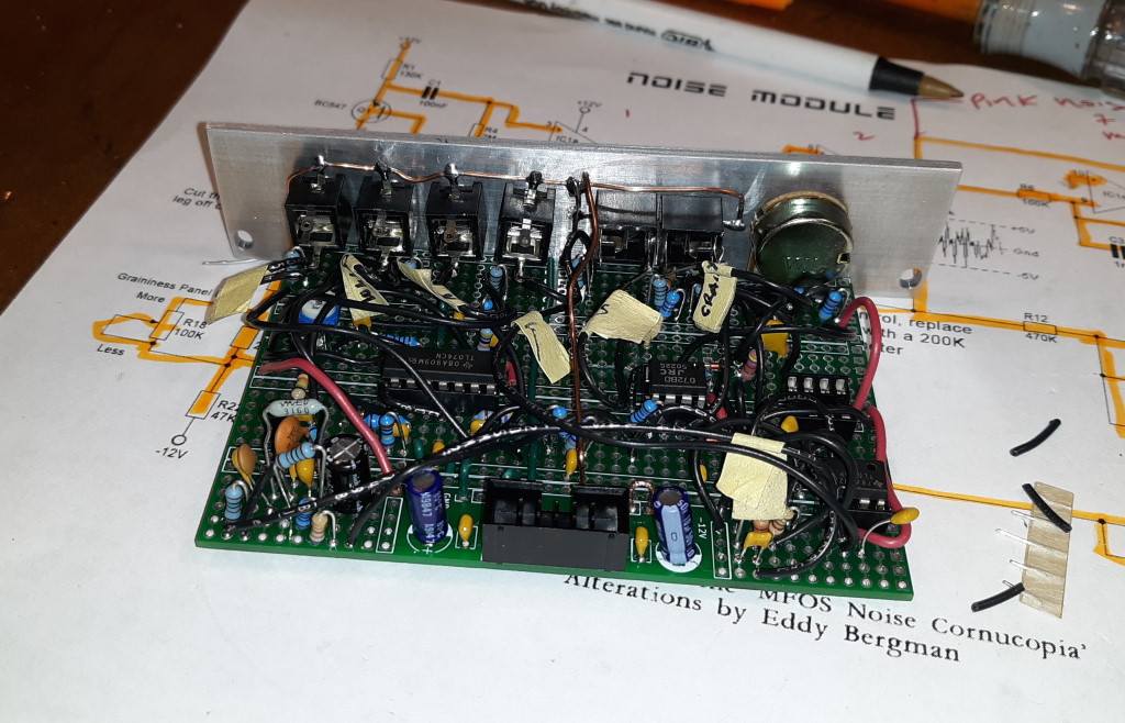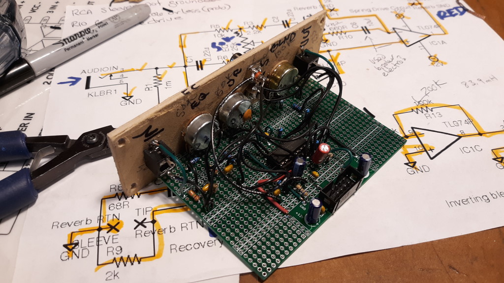 ![]() | Another module...note that larger pot(s) can be mounted to the board and support the faceplate (as Michael Barton does on many of his modules, buy his PCBs, they are great!) The faceplate is fiberboard because it's a reverb module and I needed insulation for the RCA jacks when working on the design... |